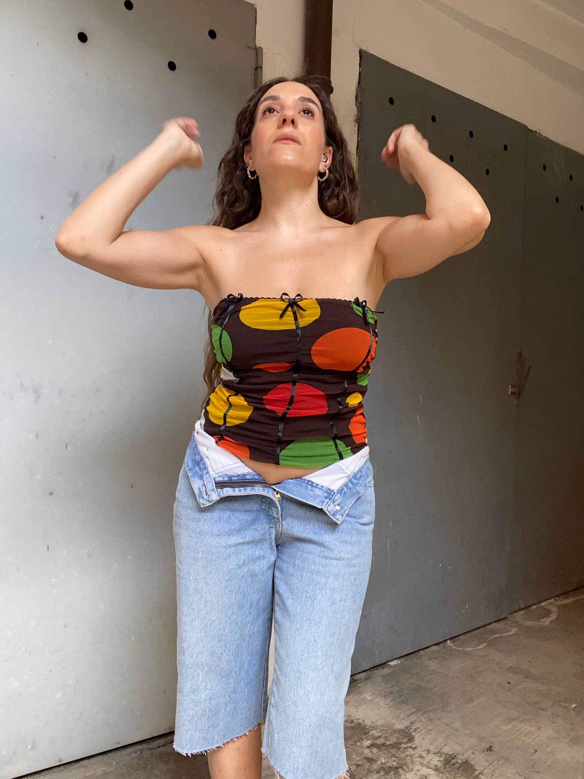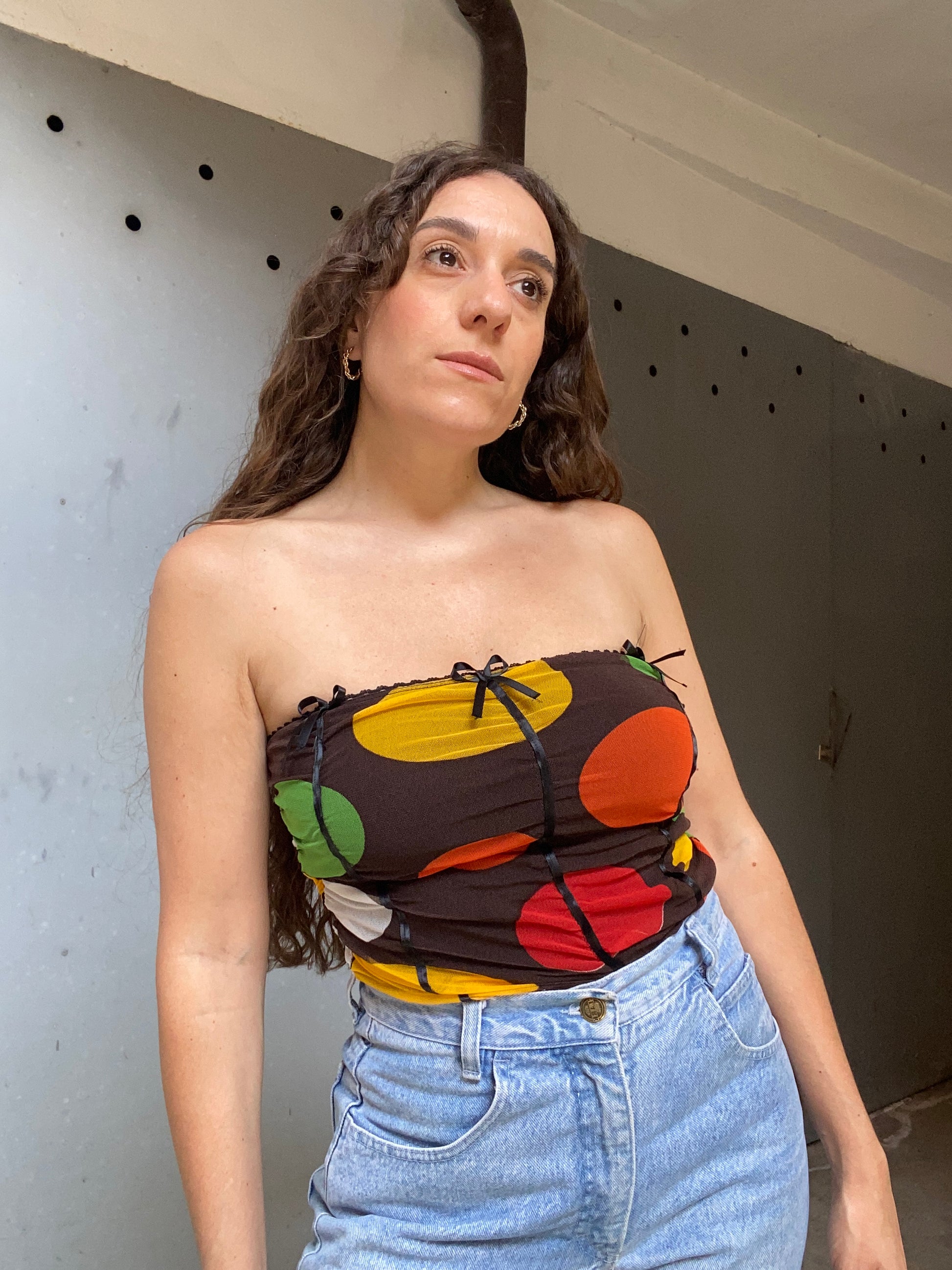 Top a fascia senza spalline, fantasia a grandi pois multicolore su fondo marrone.