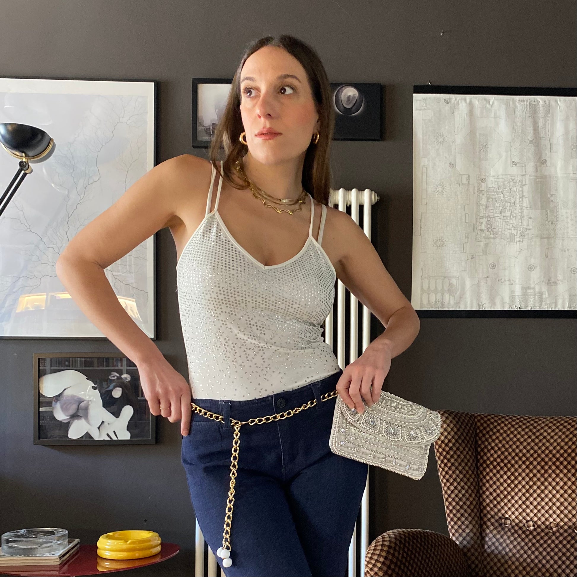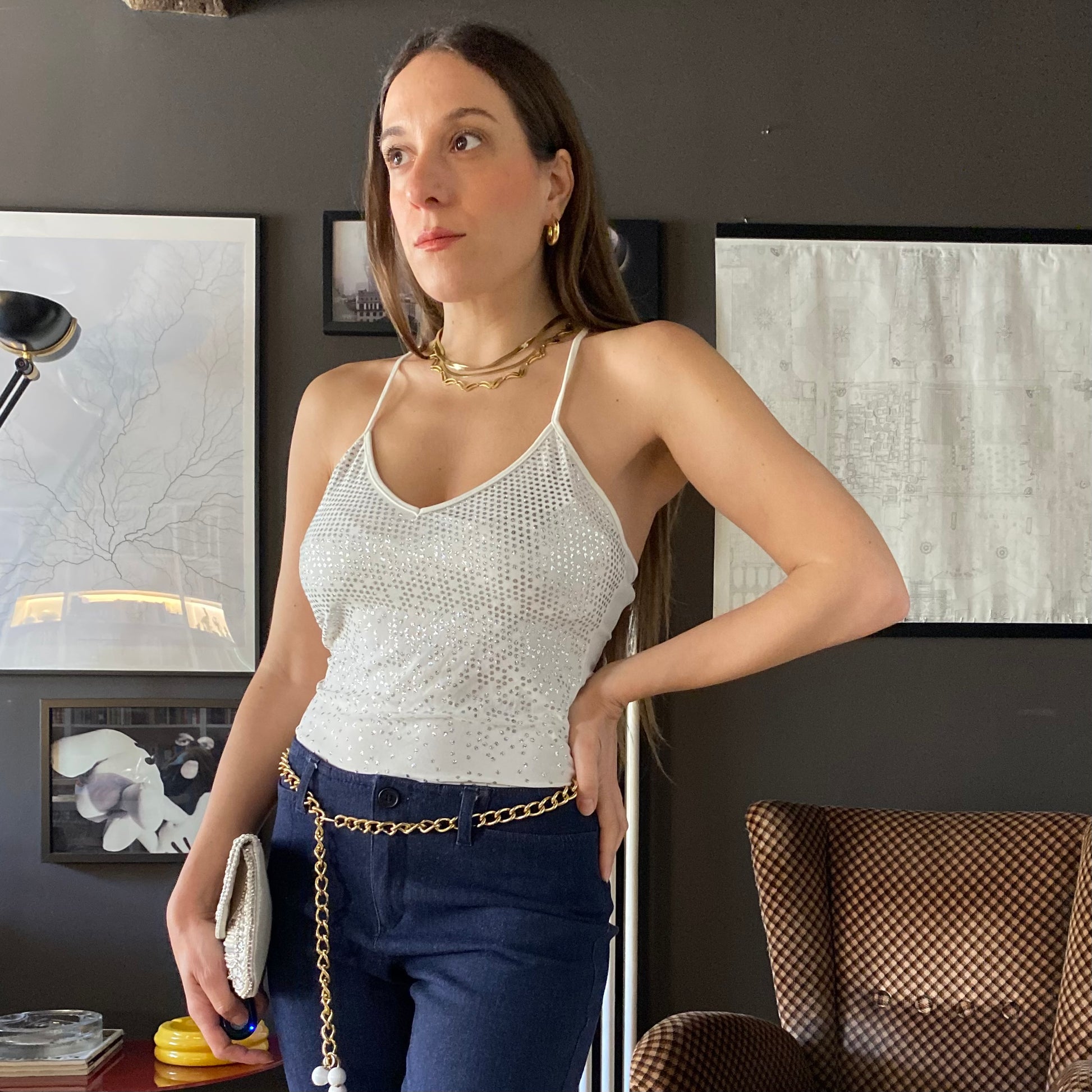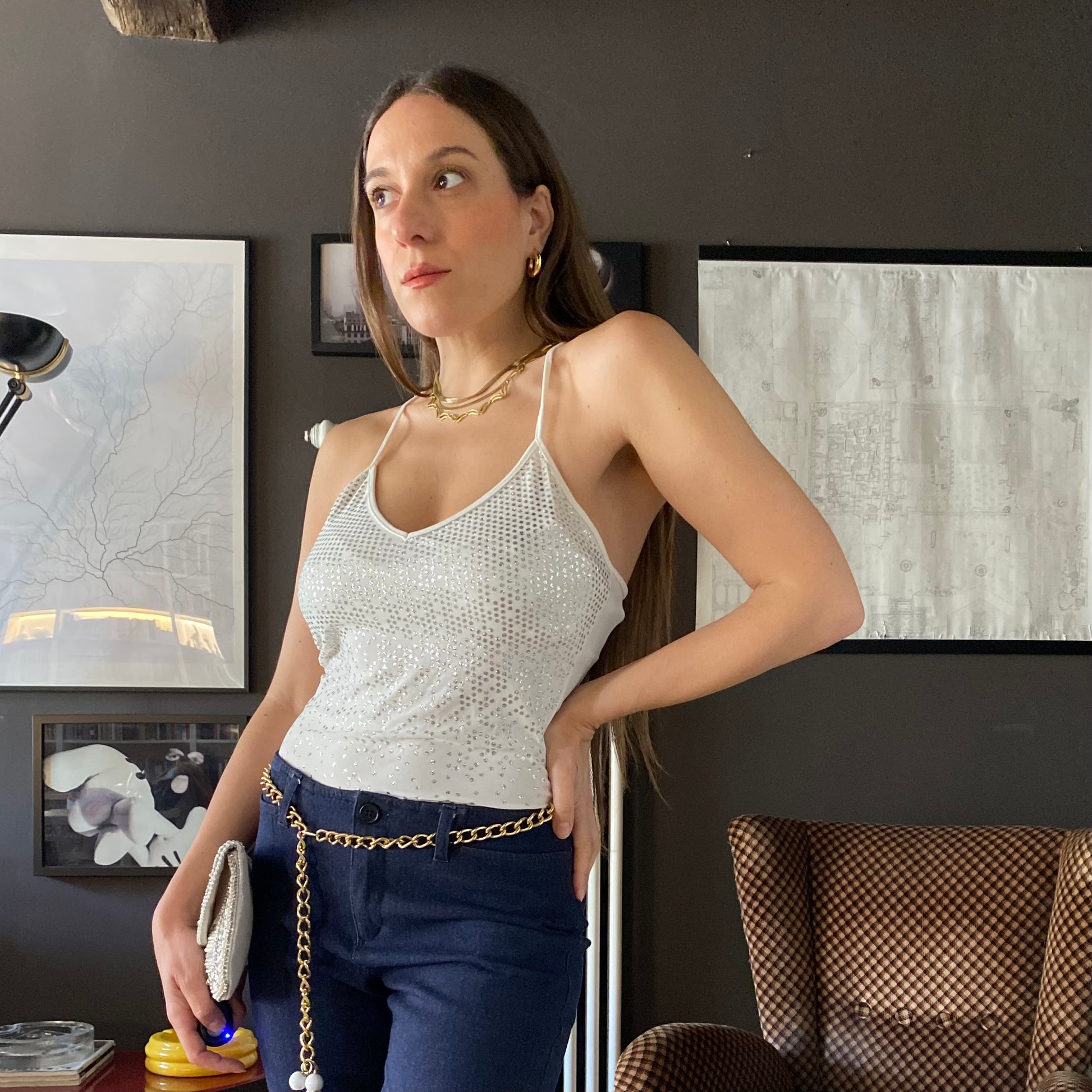 Elasticizzato con scollo a Ve bratelline sottili incrociate sul retro e scollo dritto.
