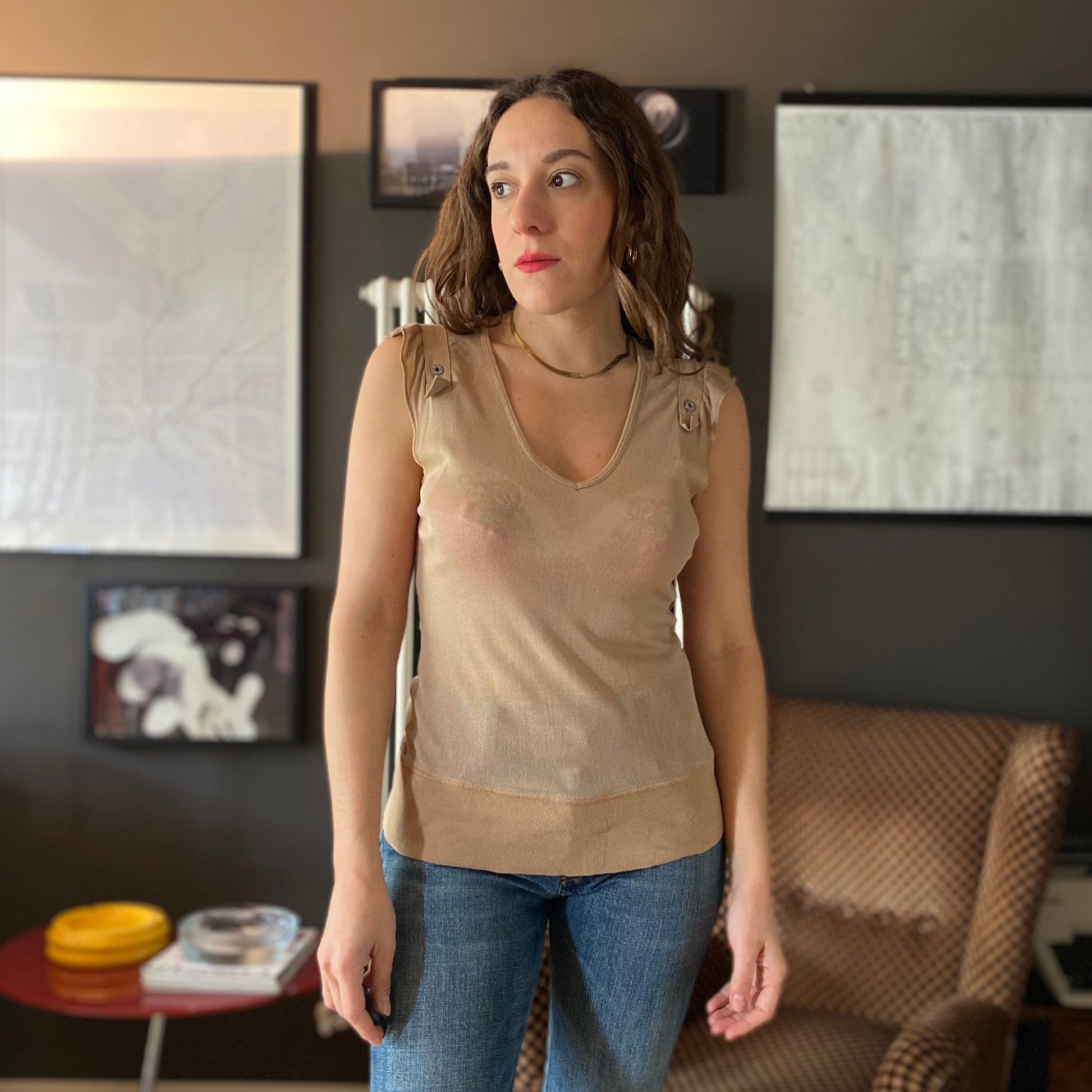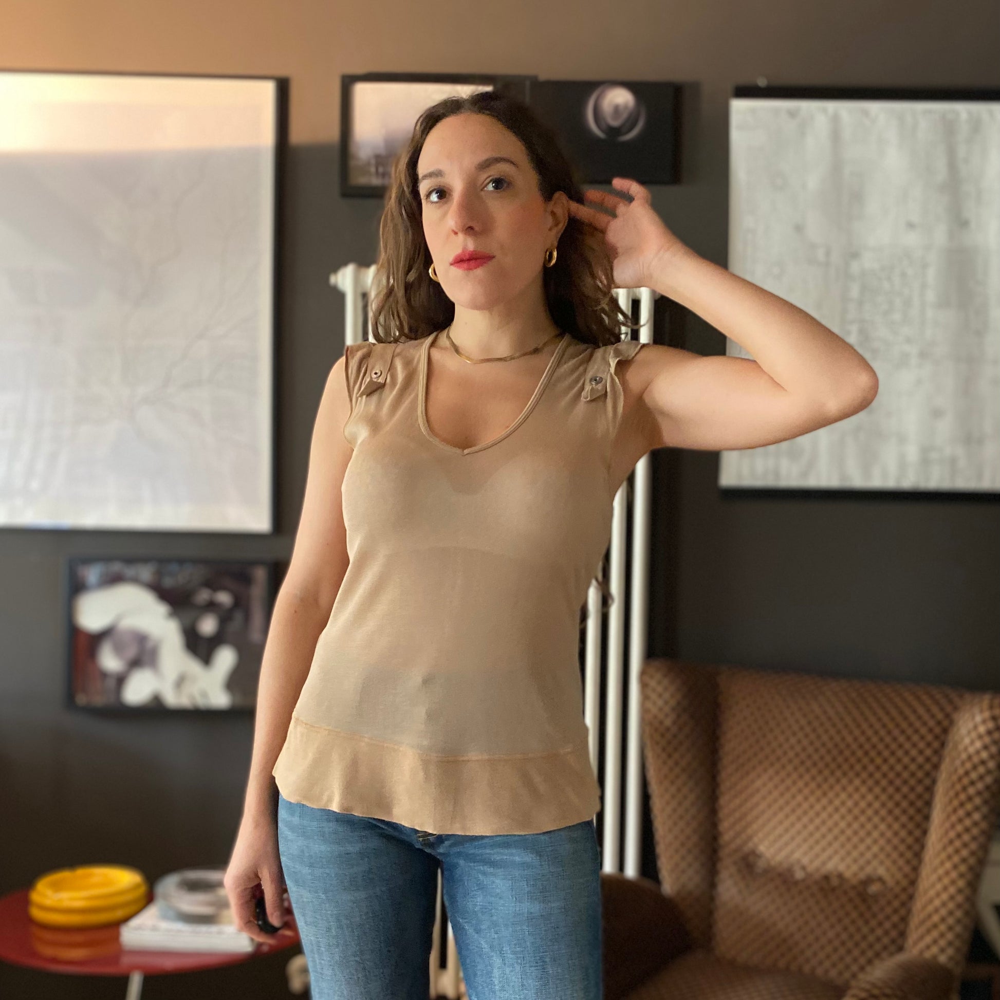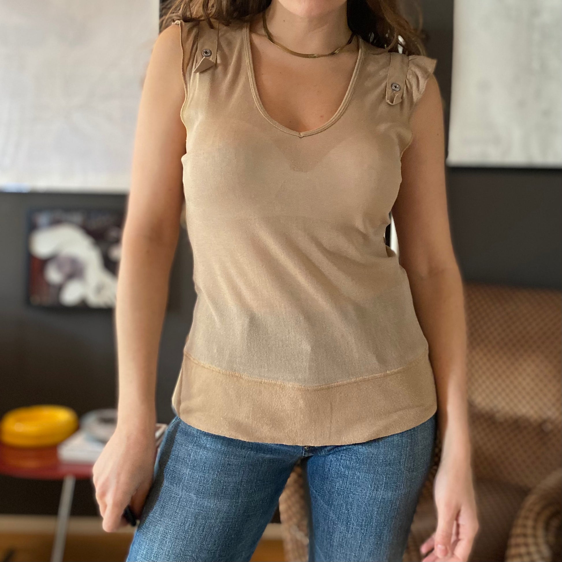 Leggermente trasparente, in bel color beige con cuciture a vivo. Giromanica con piccolo volanta lattuga. sulla spalla una fettuccia in cotone con rivetto logato.