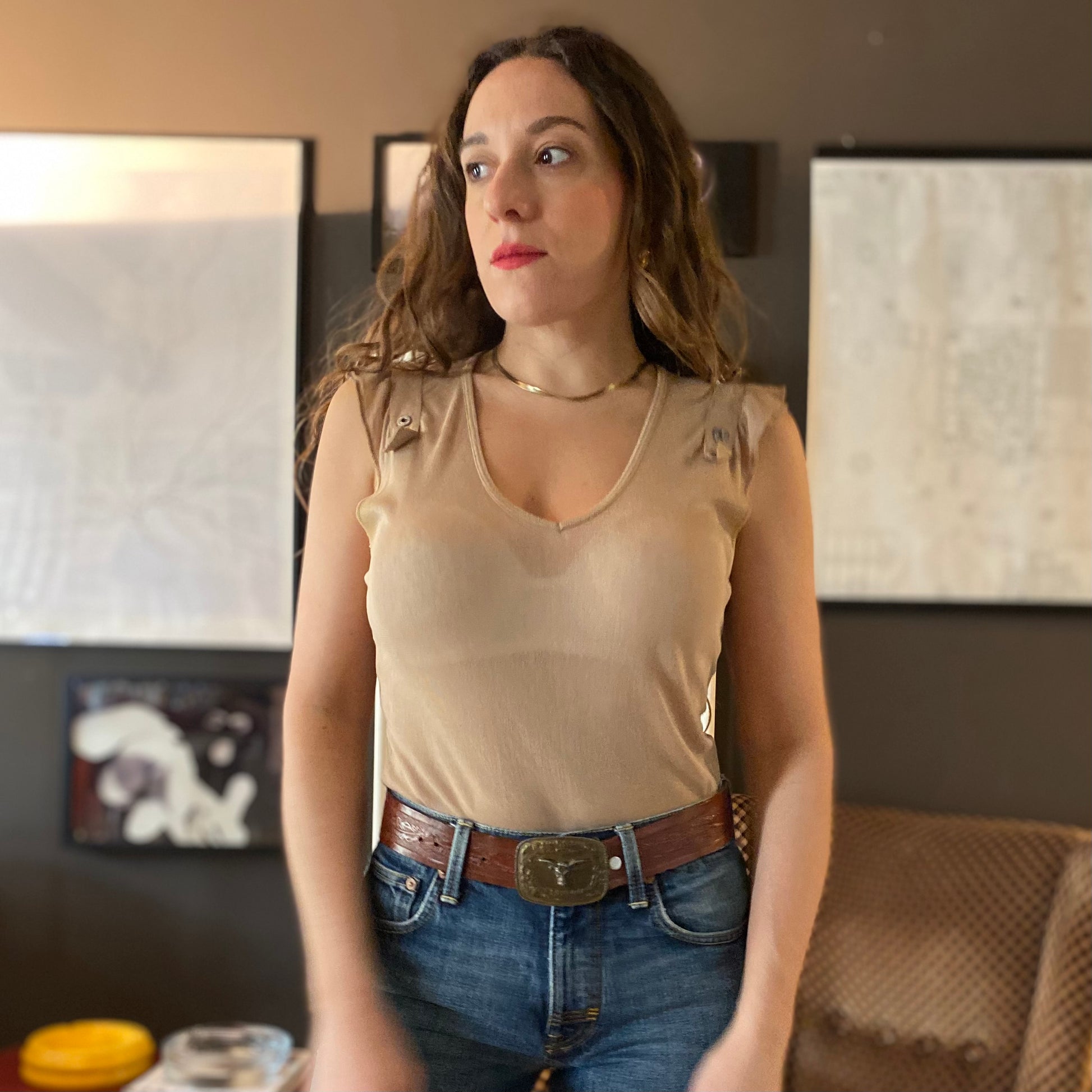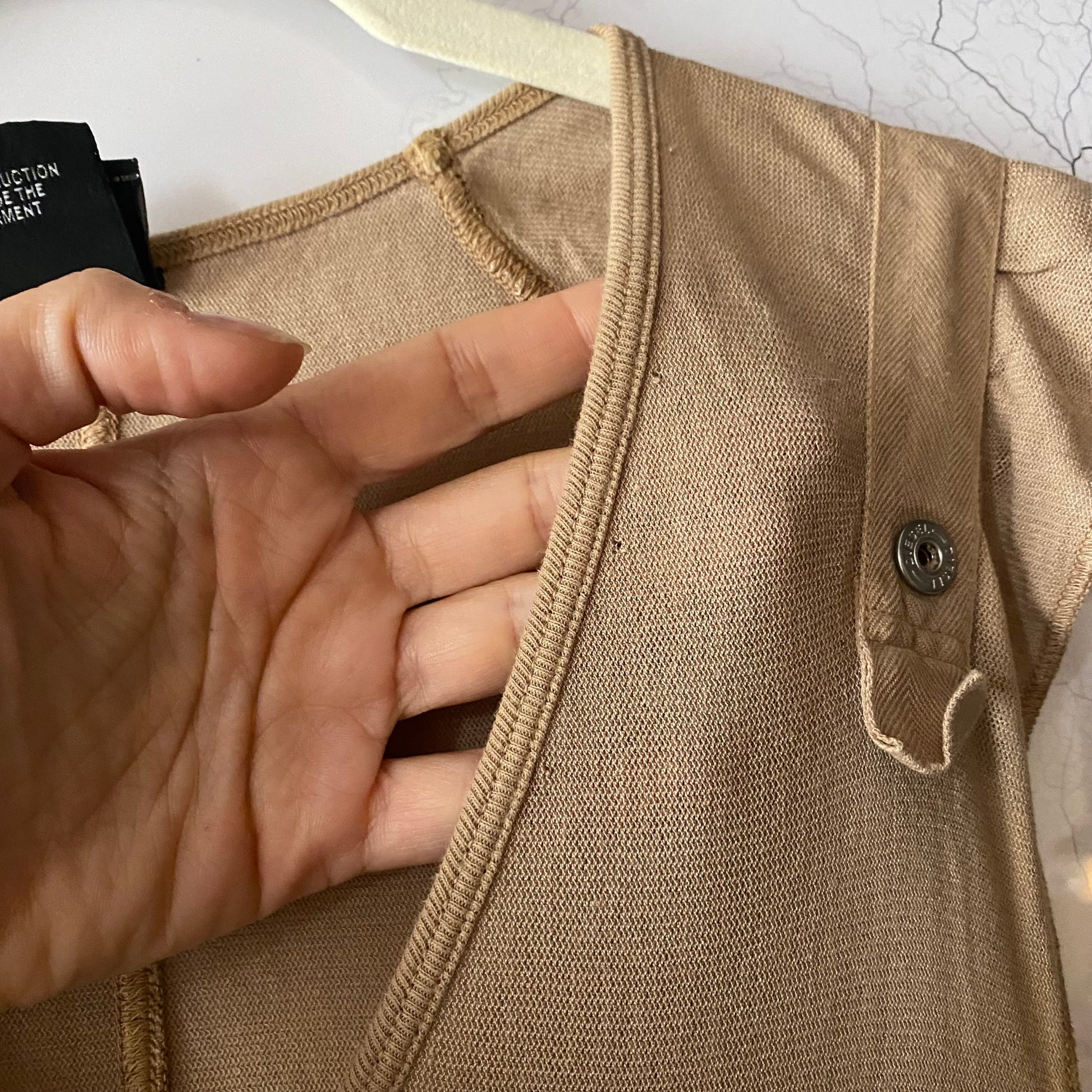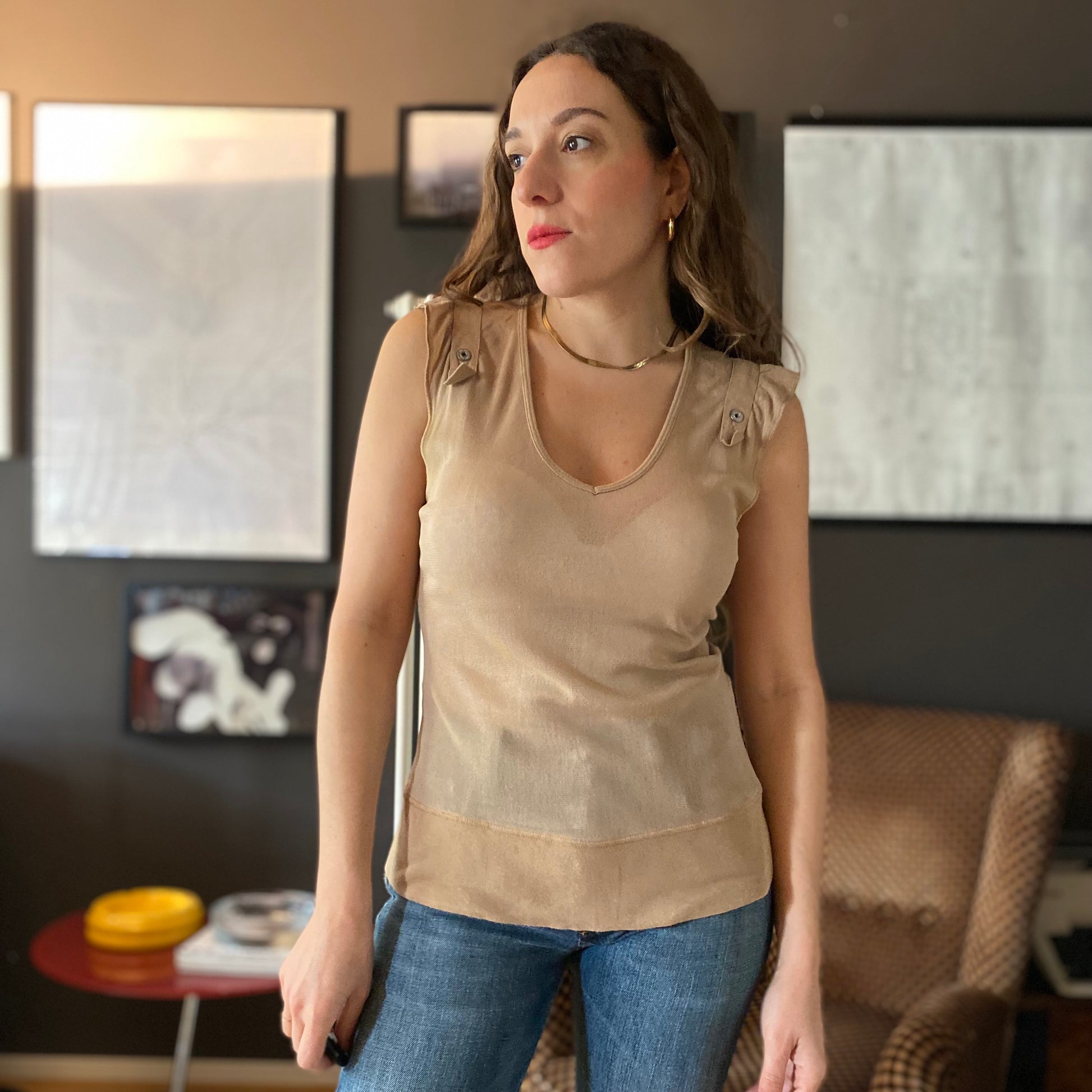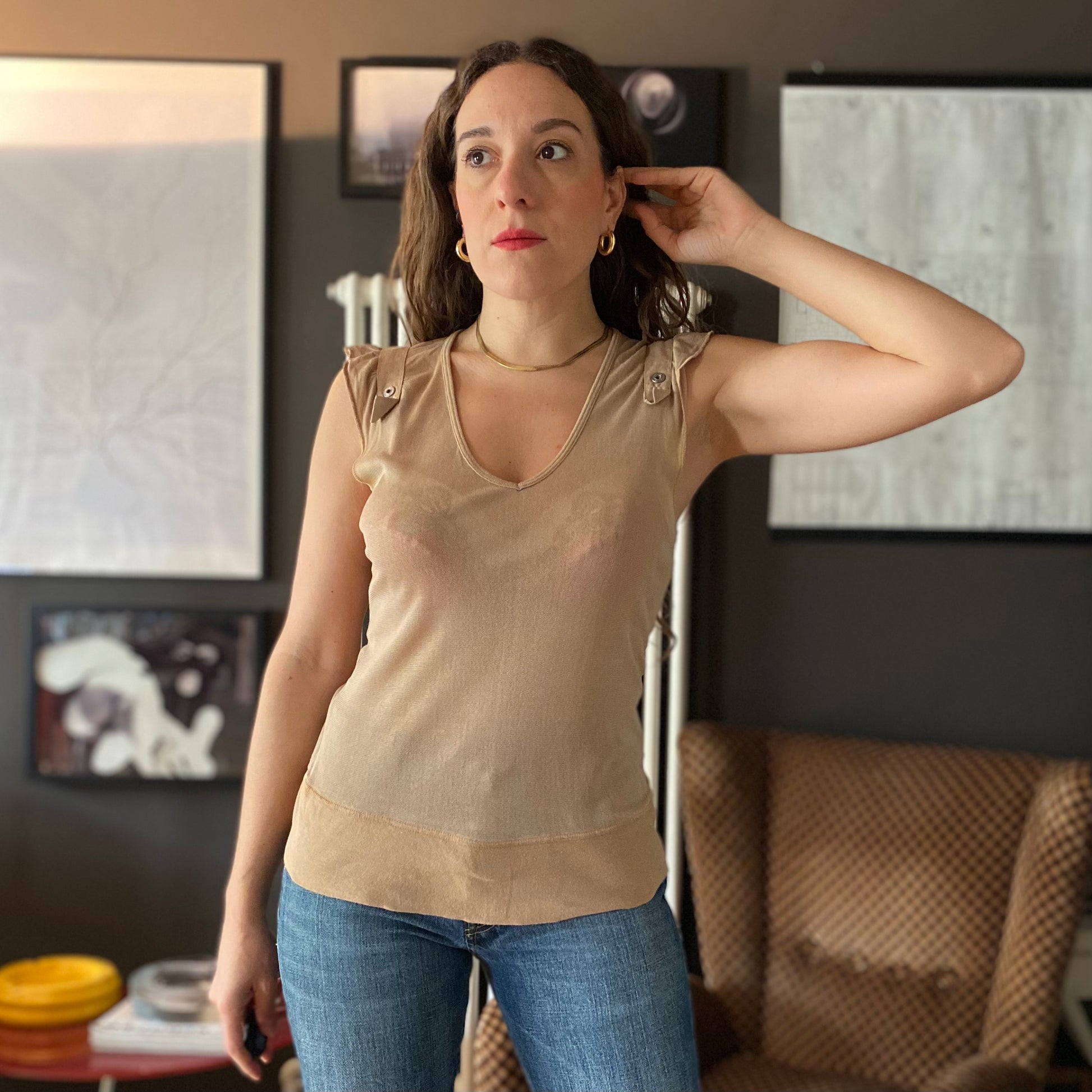 Leggermente trasparente, in bel color beige con cuciture a vivo. Giromanica con piccolo volanta lattuga. sulla spalla una fettuccia in cotone con rivetto logato.