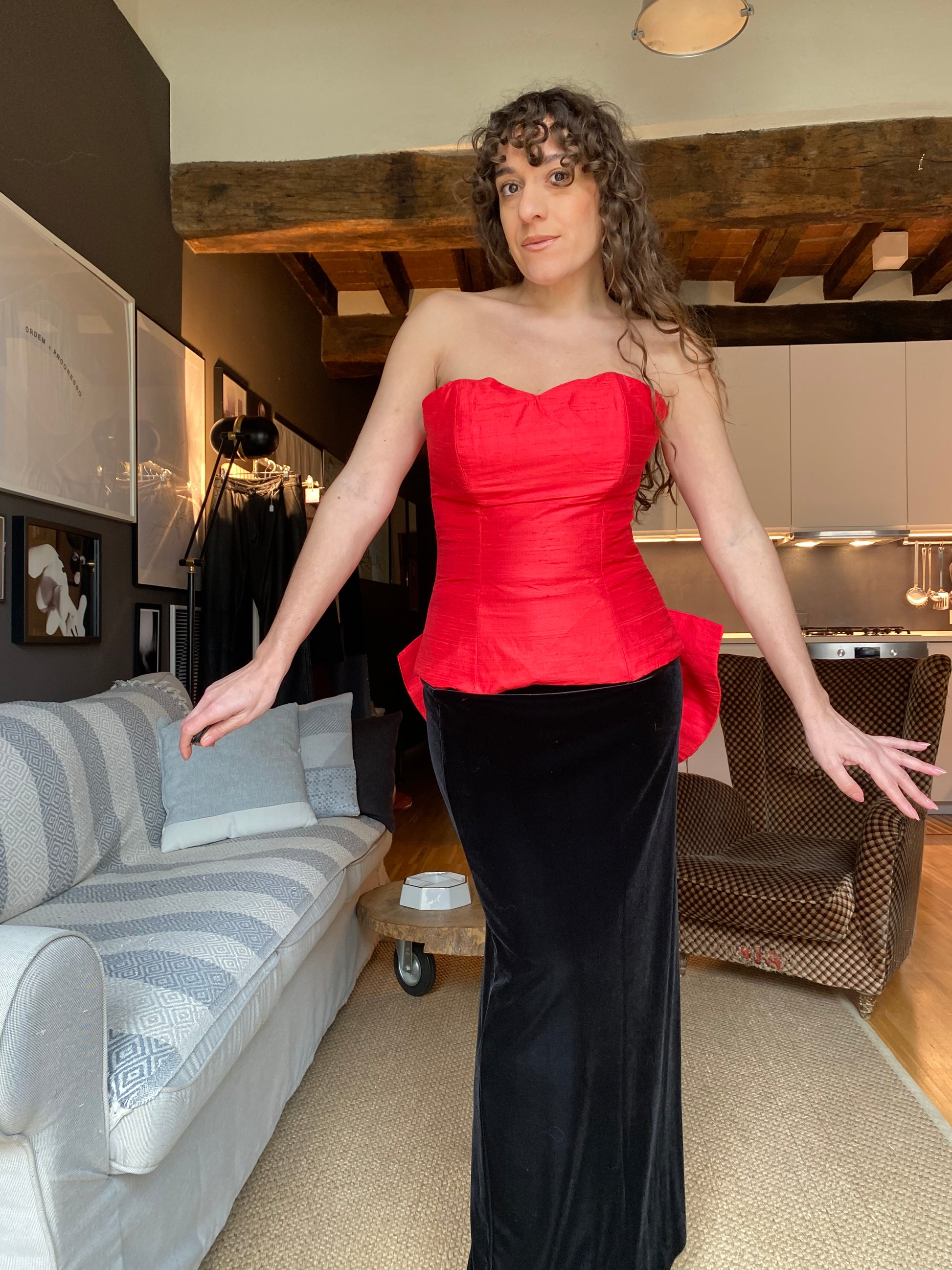 Lo scollo é a cuore, senza spalline, aderente sul punto vita, più accogliente sul seno.