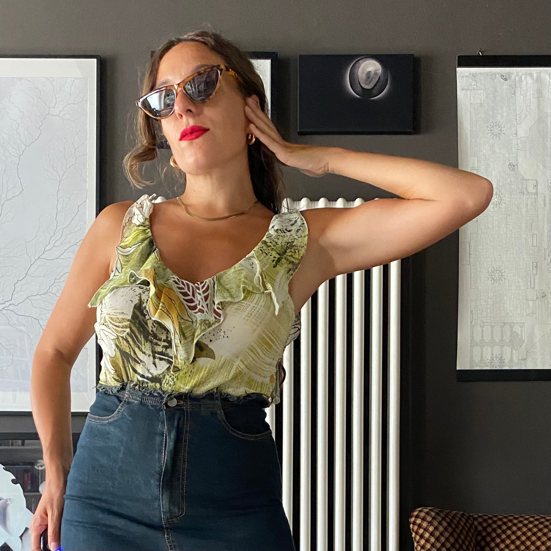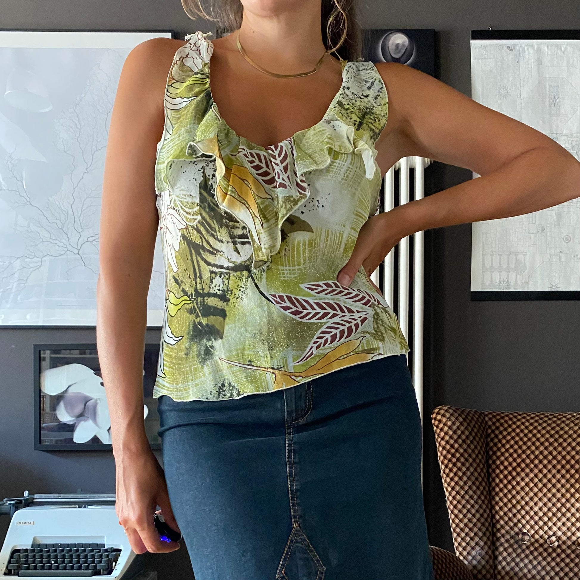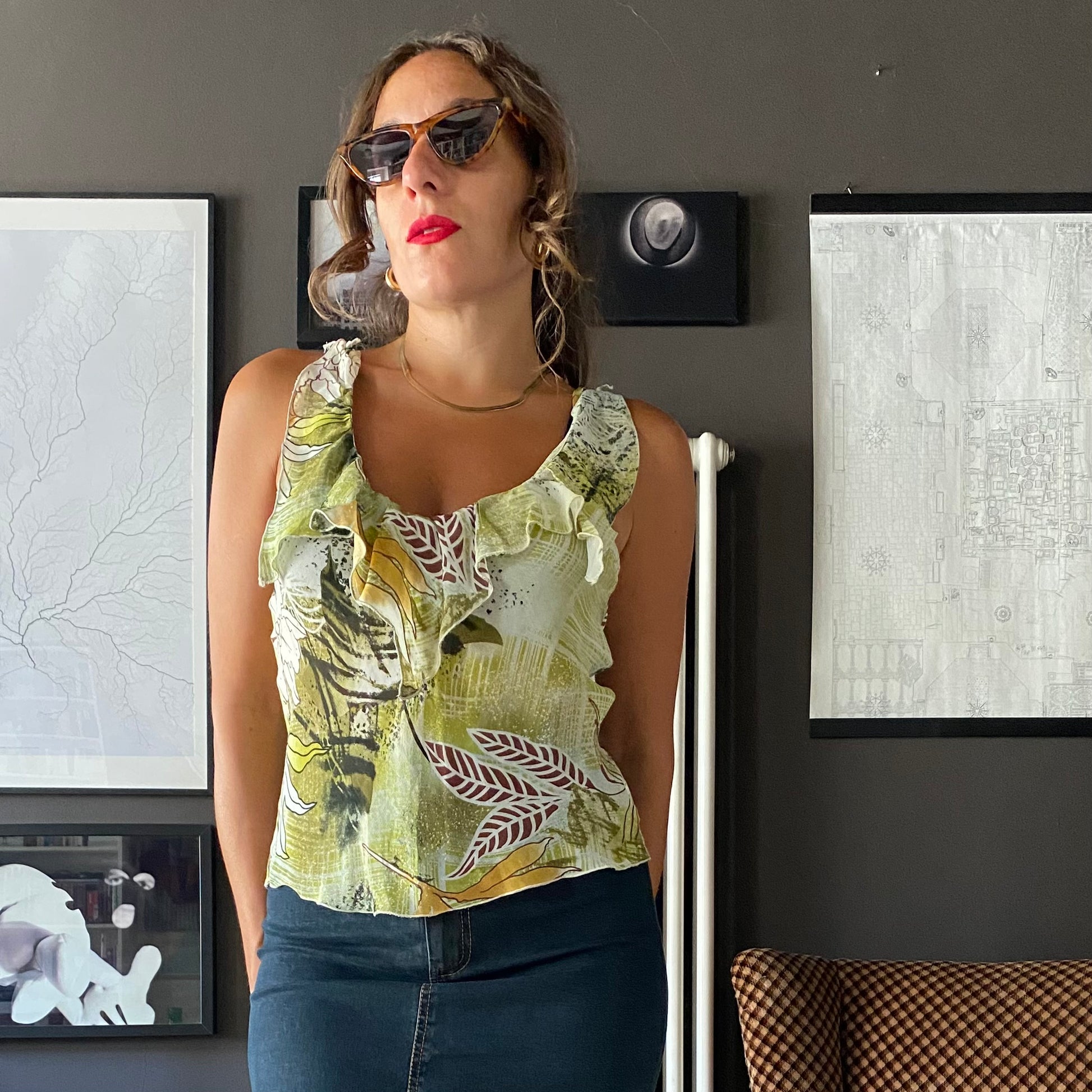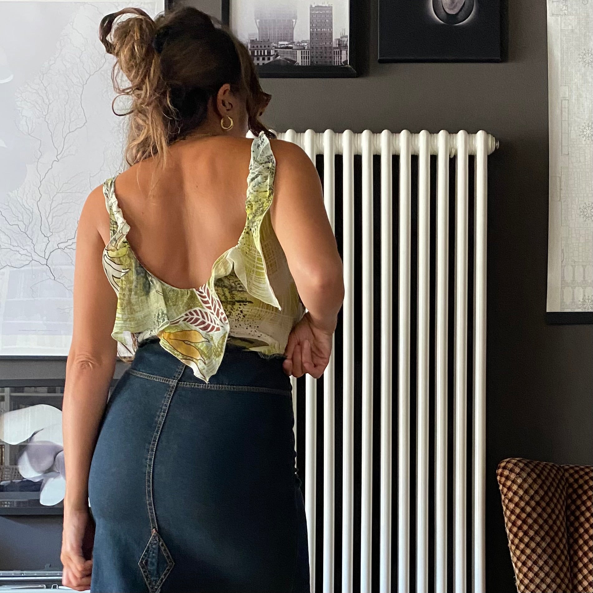 Top anni 2000 con volant sul decolleté e profondo scollo sulla schiena.