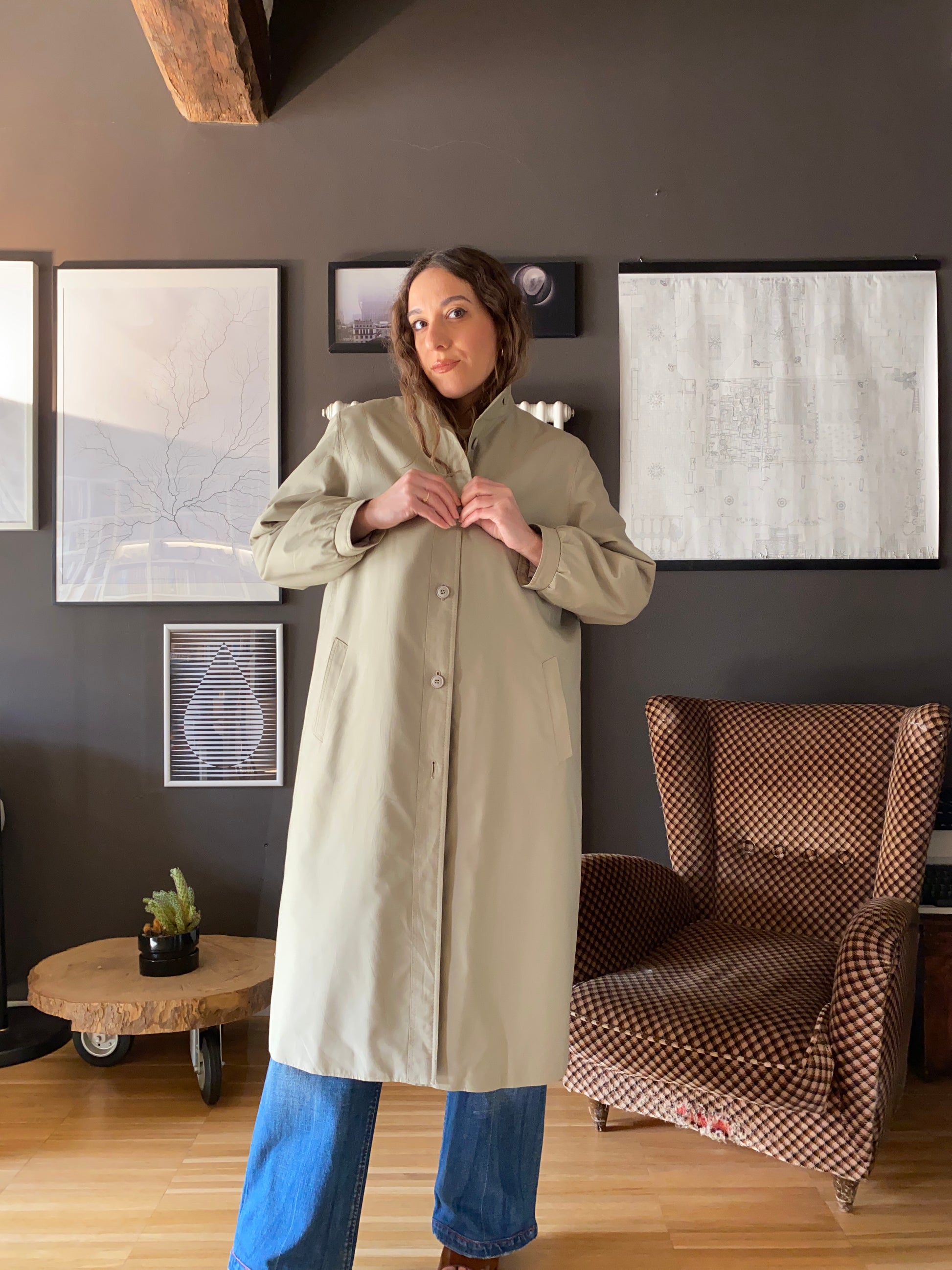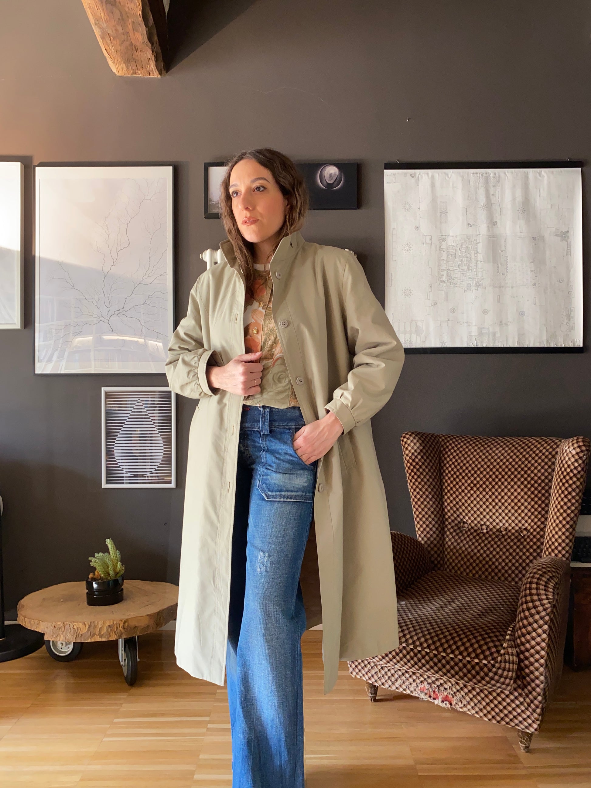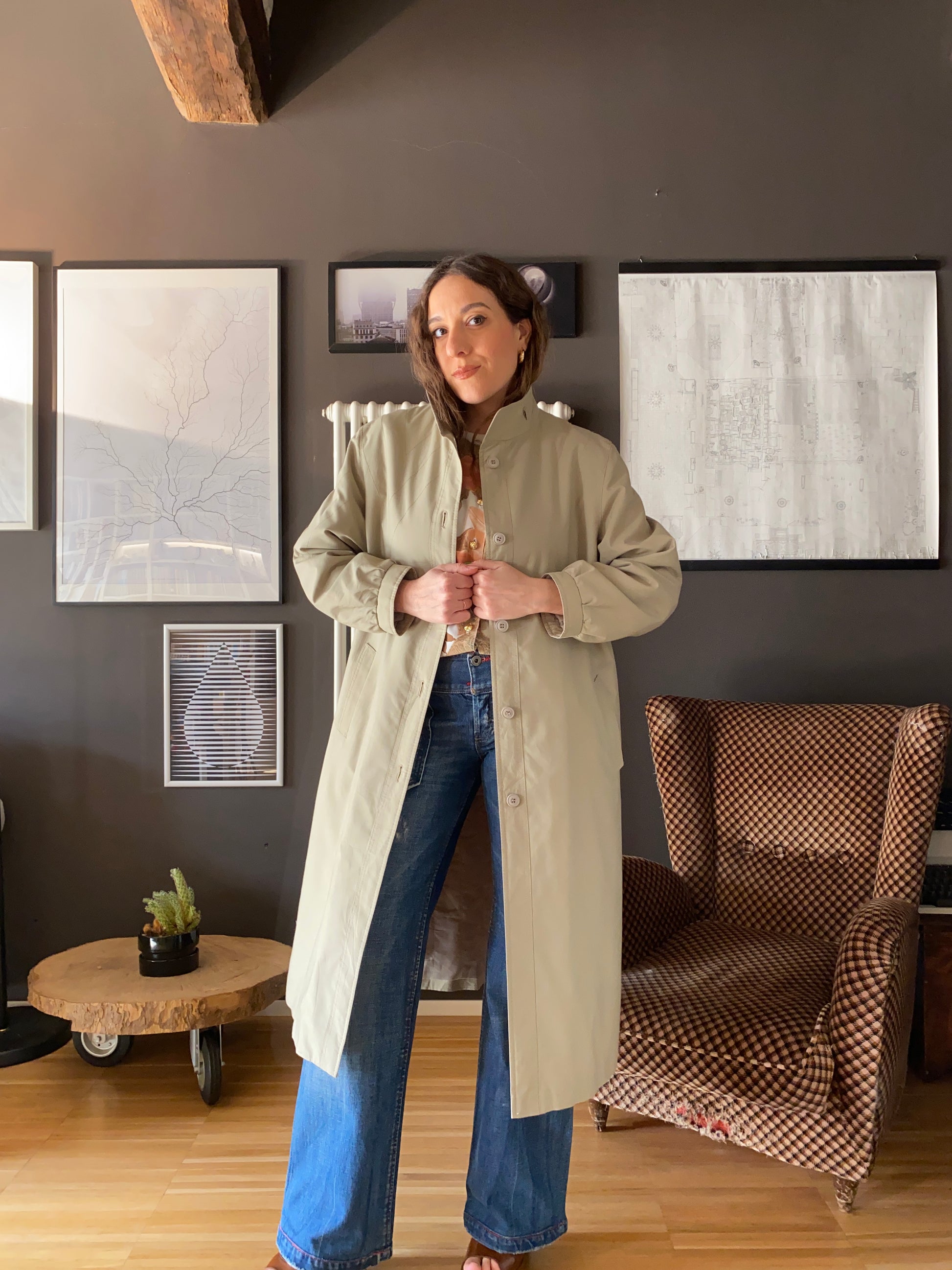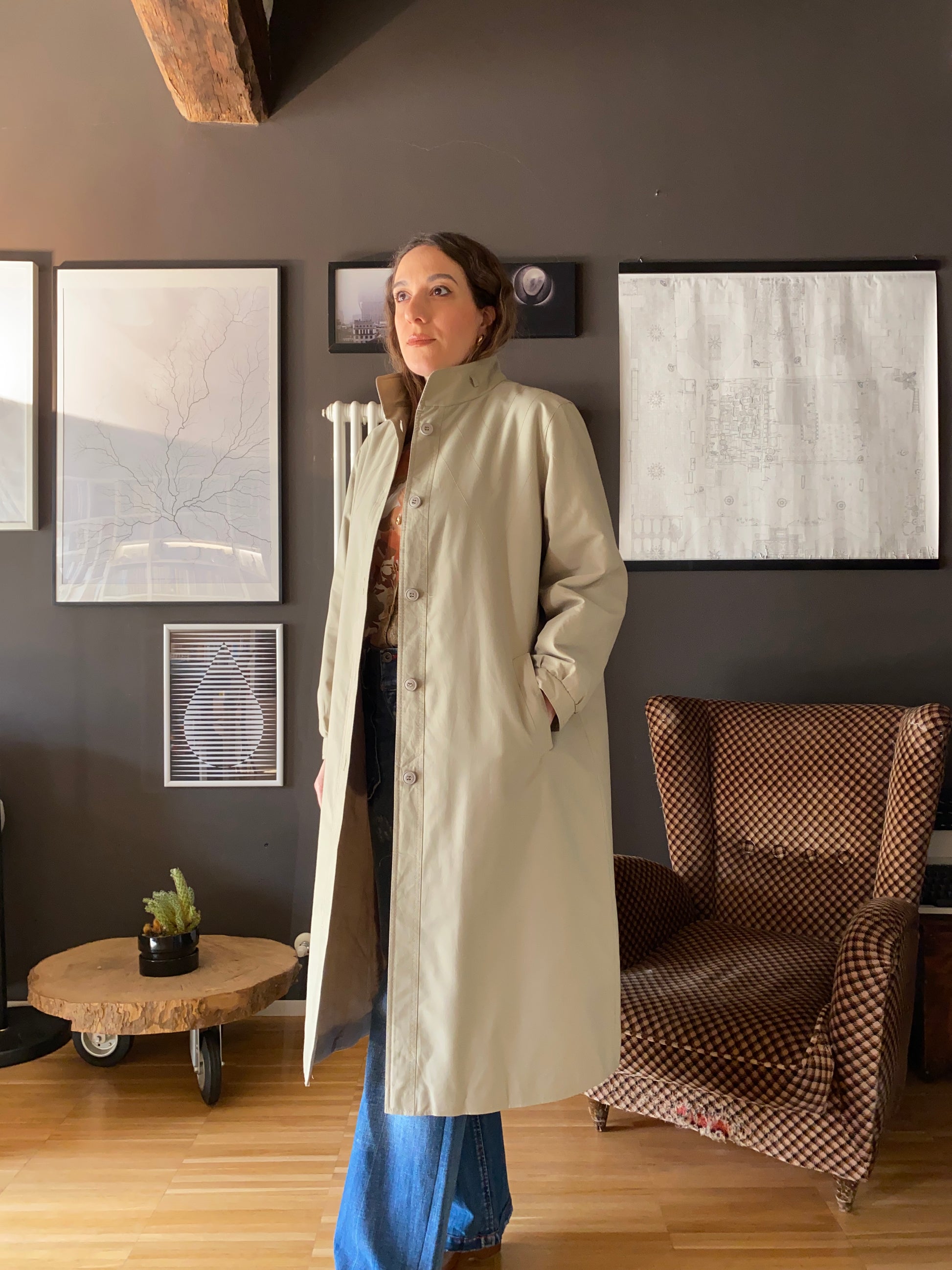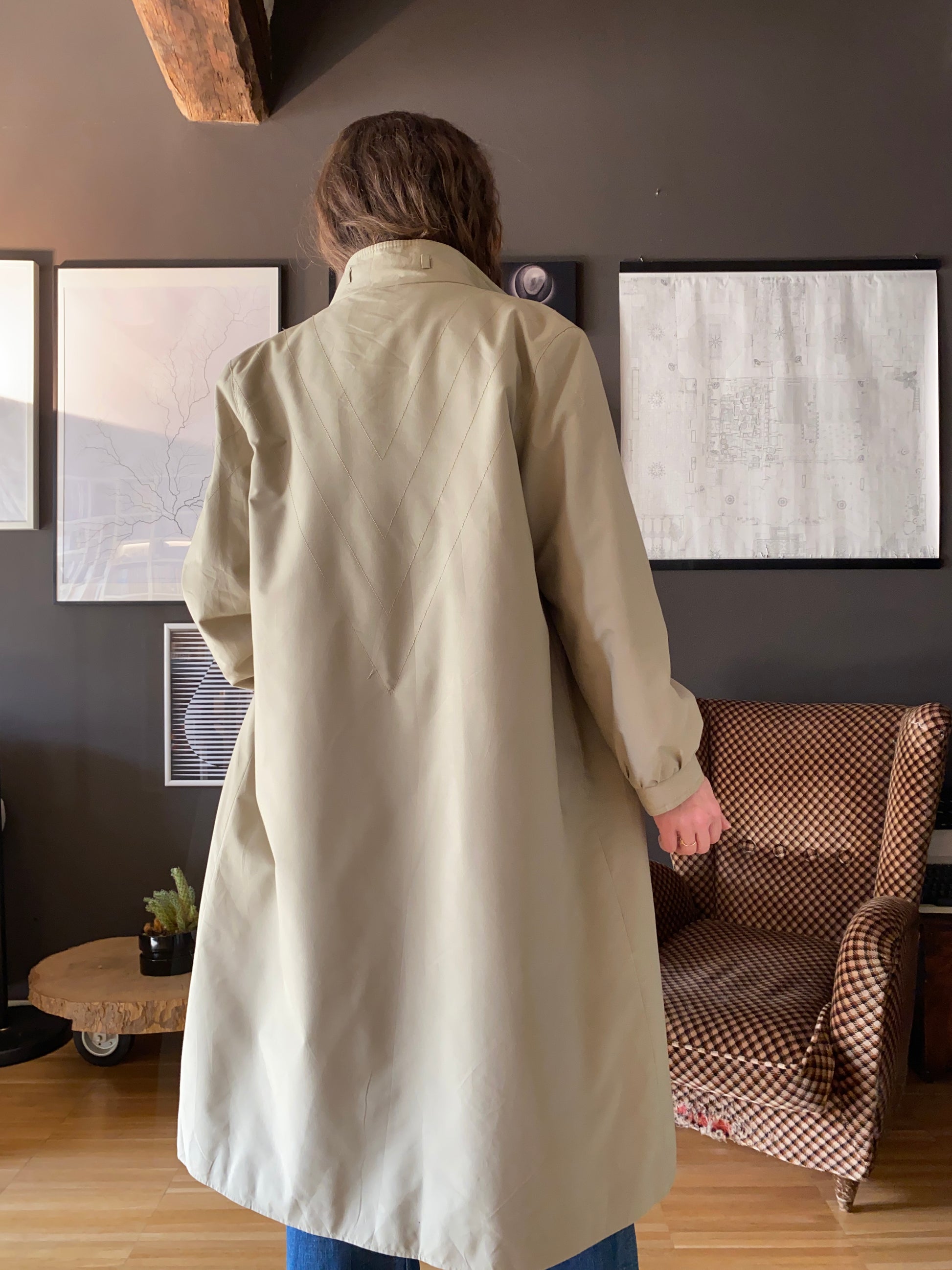 Bellissimo trench anni 70, leggermente trapuntato, linea ad A, con colletto tipo coreana con passanti da cui probabilmente in origine passava un cinturino tristemente andato perduto (consiglio di rimpiazzare eventualmente con un foulard).