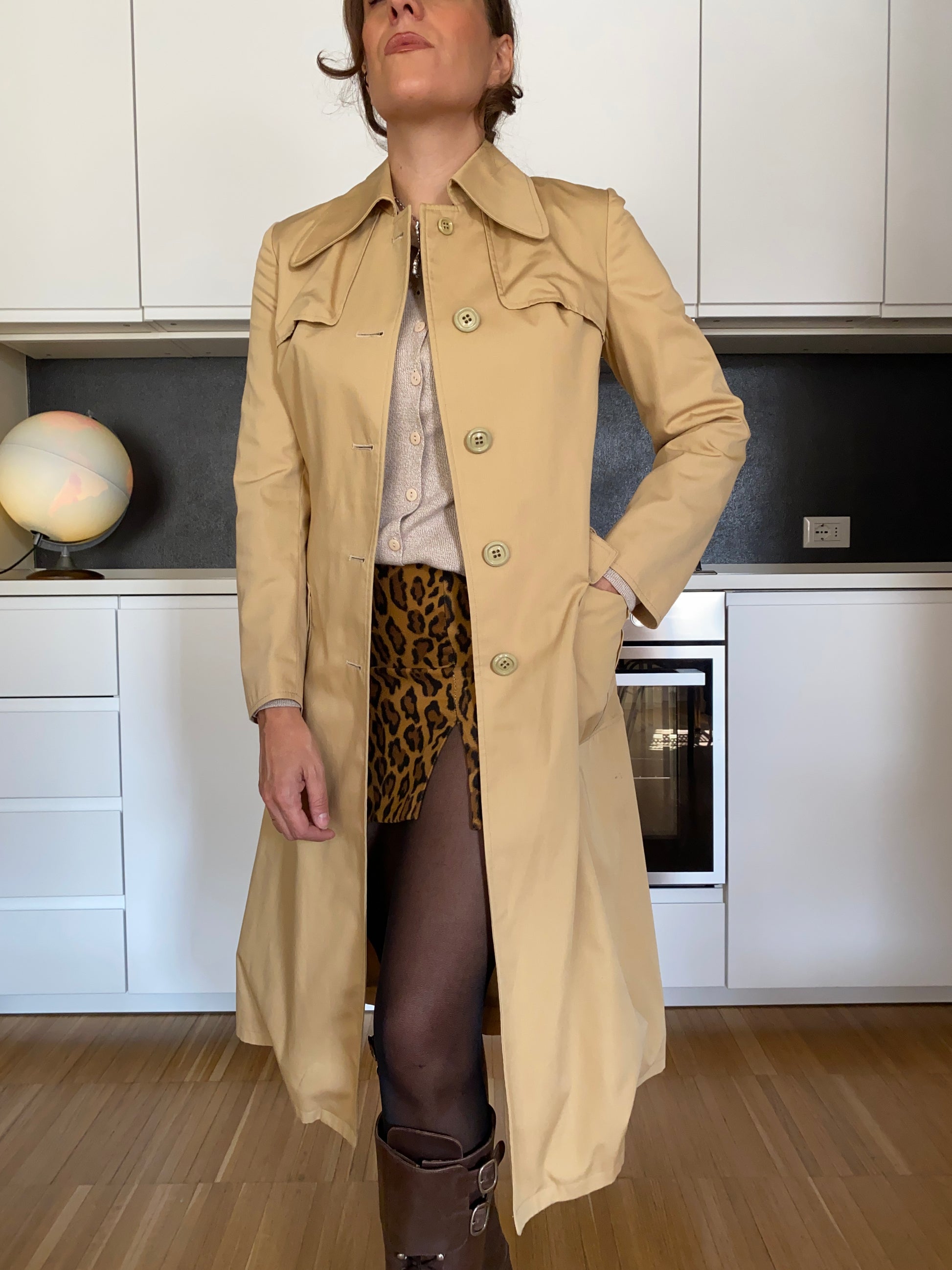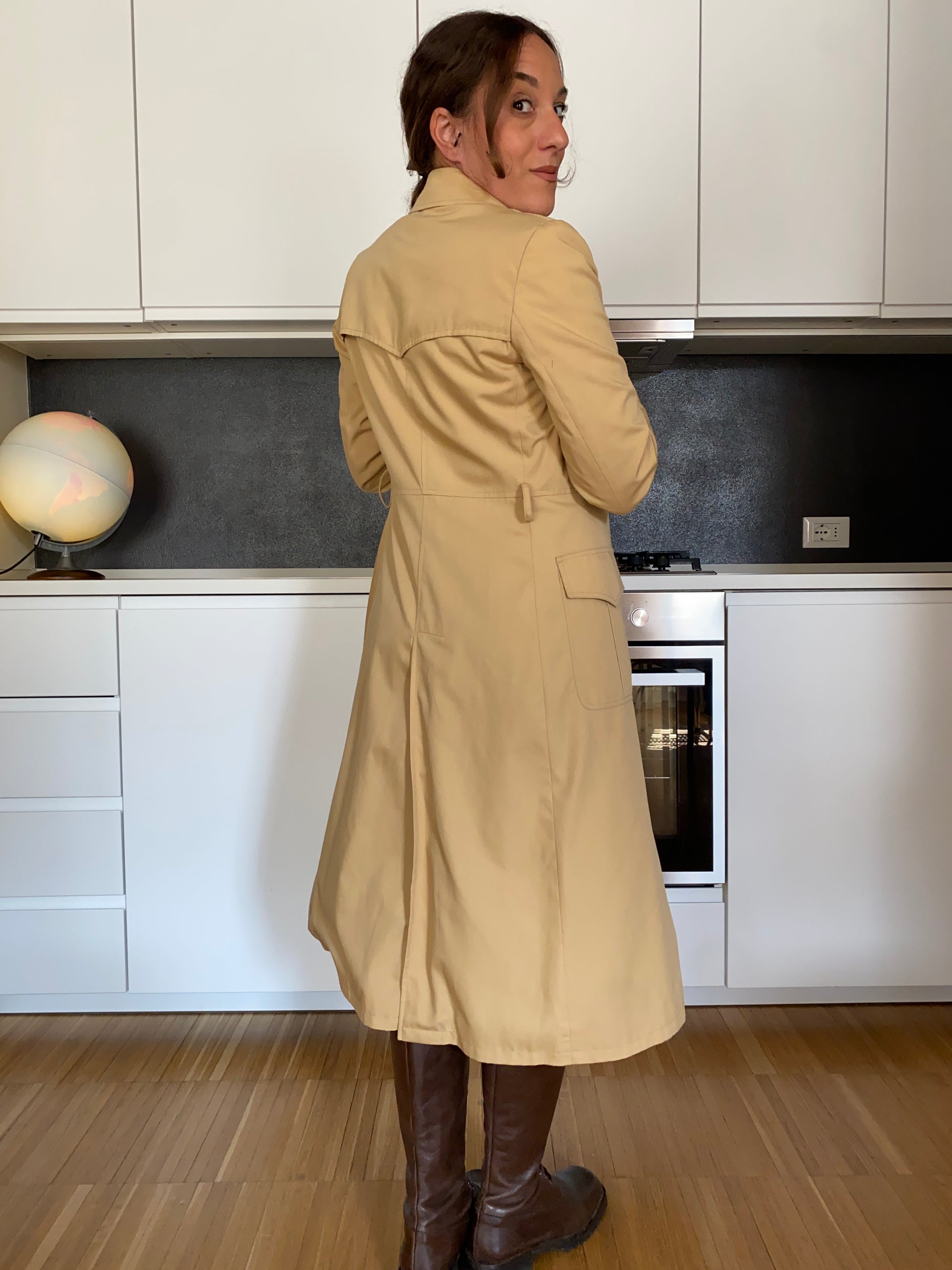 Meraviglioso trench originale anni ’70, dal taglio strutturato e realizzato in tessuto sostenuto.